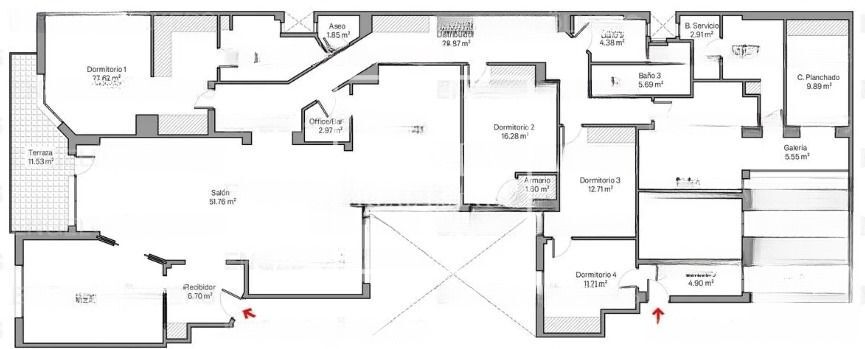 Con 391 m² construidos, el piso ofrece estancias amplias y luminosas, con techos de tres metros de altura y una cuidada distribución que potencia la luz natural. La zona social cuenta con varios ambientes y acceso directo a una terraza de 15 m² orientada al Sureste.