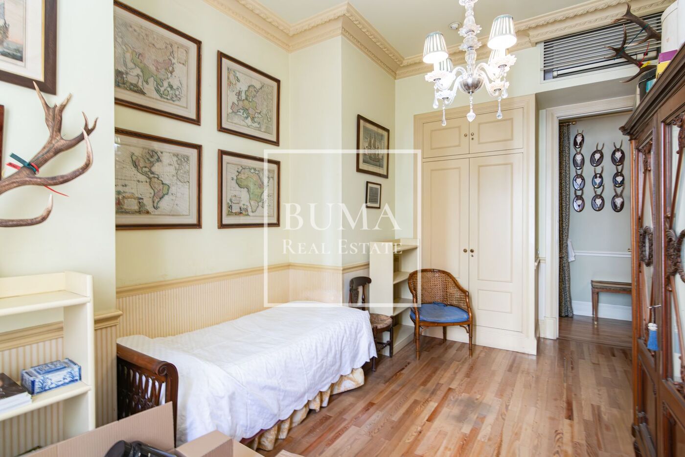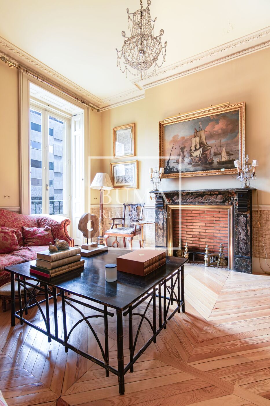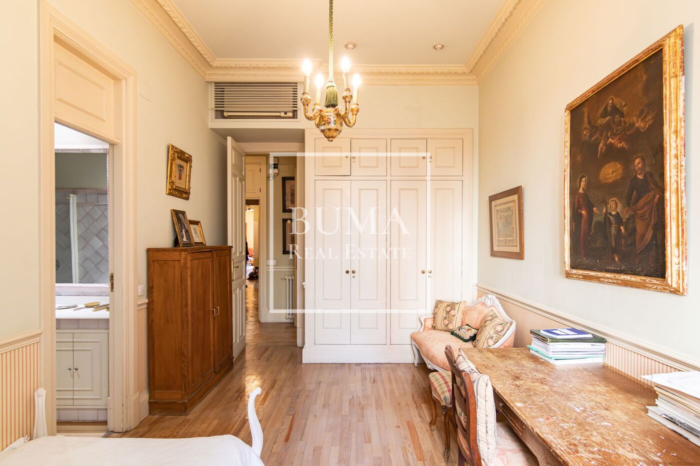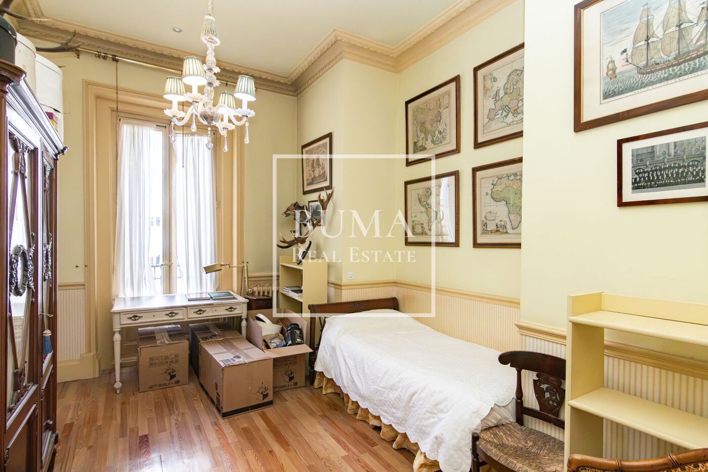La vivienda destaca por sus amplias dimensiones, techos altos de más de tres metros de altura y elementos regios de la época como las chimeneas de mármol, molduras y suelo original de pino melis.