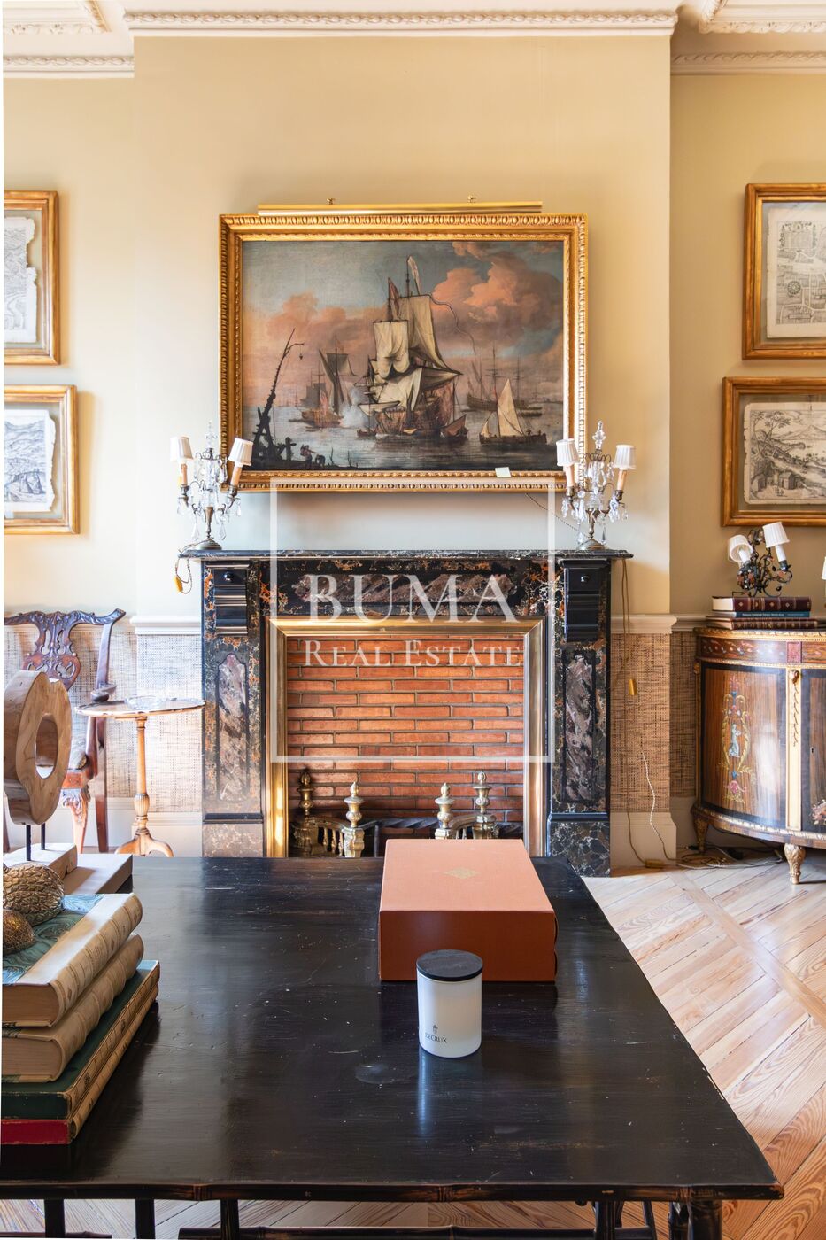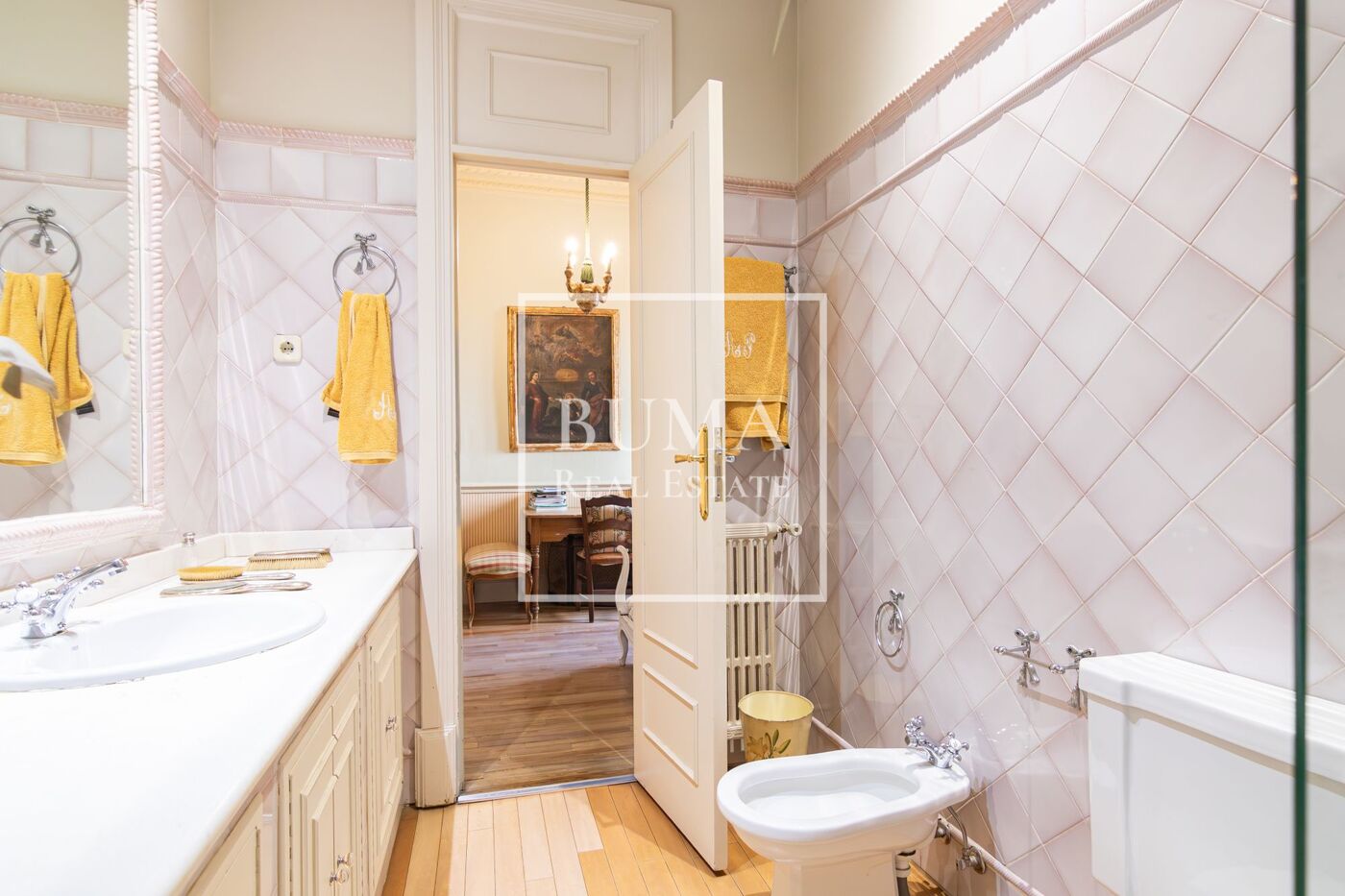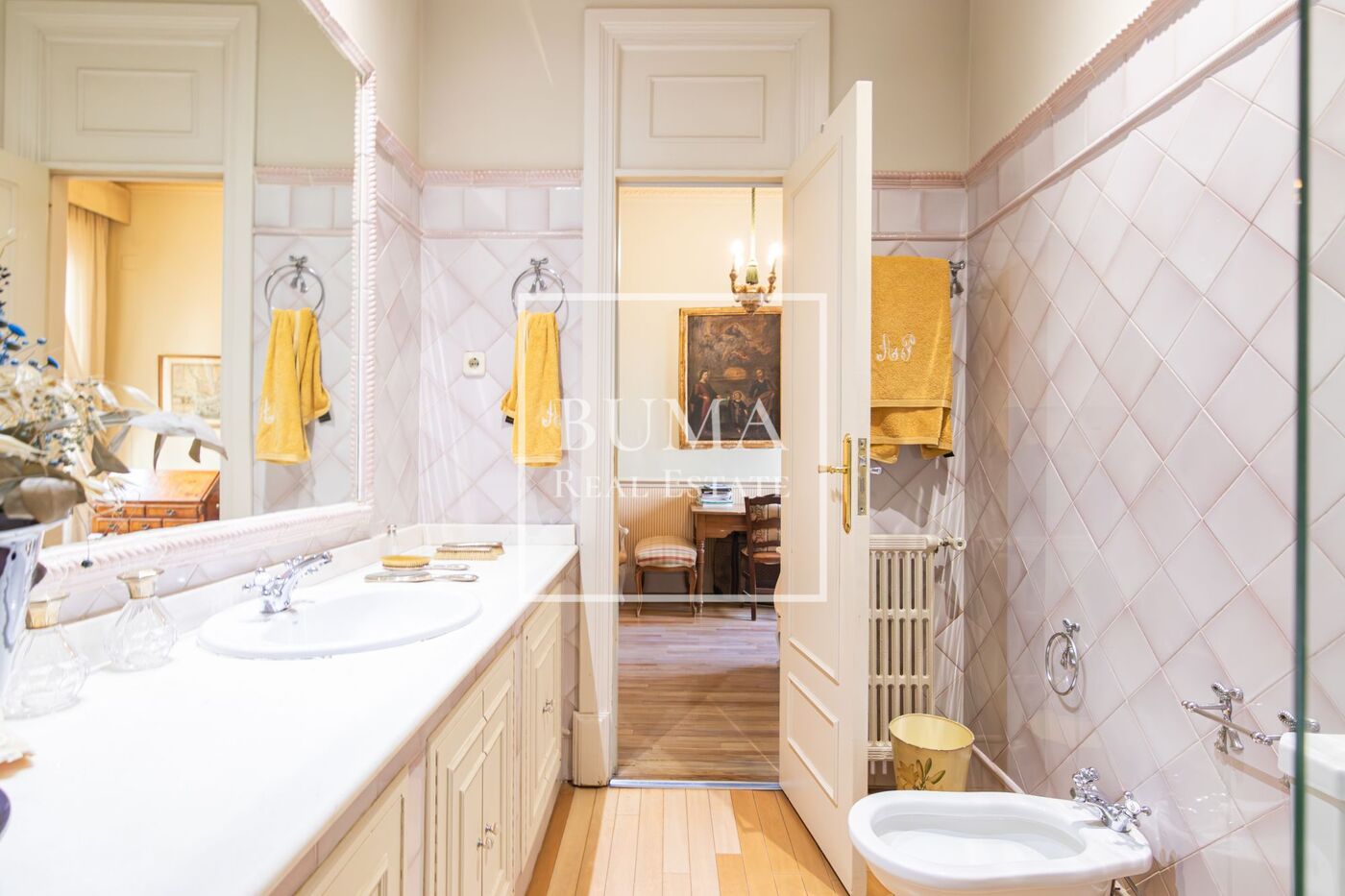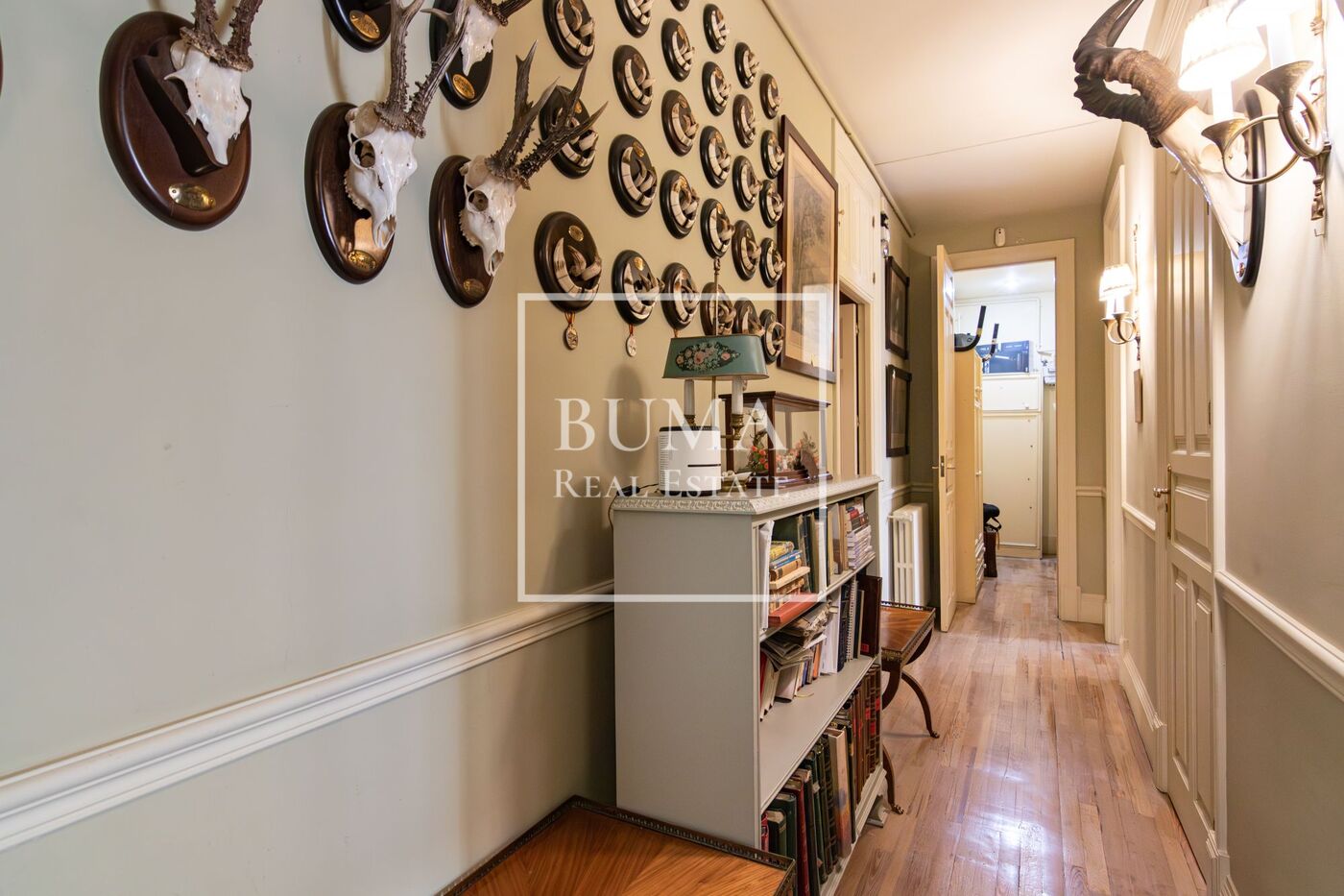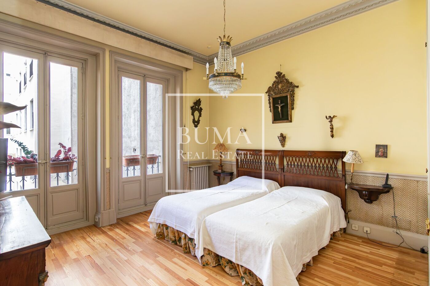 La vivienda destaca por sus amplias dimensiones, techos altos de más de tres metros de altura y elementos regios de la época como las chimeneas de mármol, molduras y suelo original de pino melis.