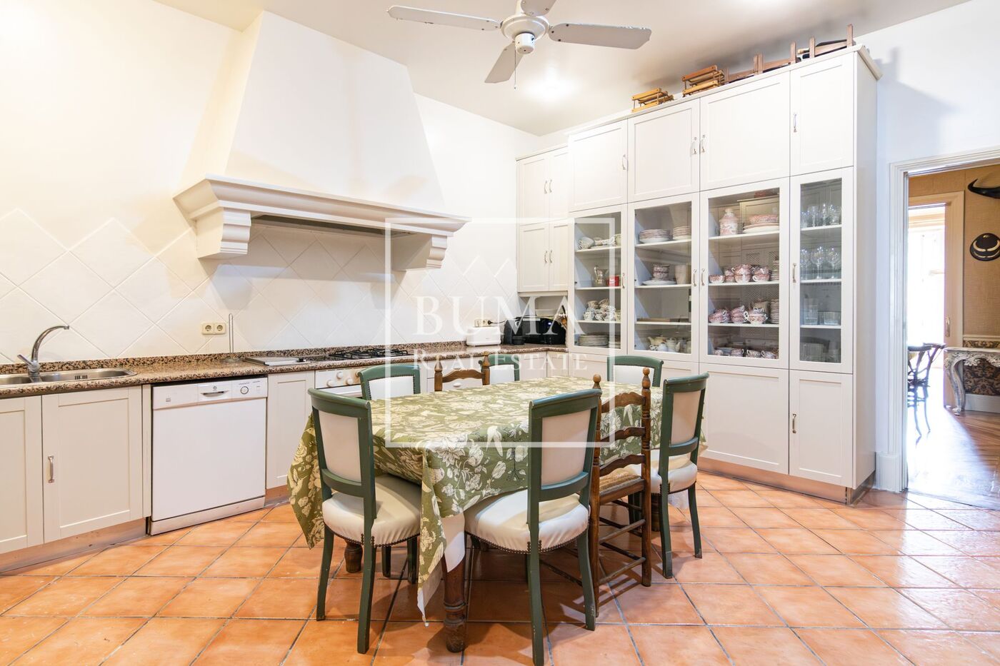 La distribución actual se compone de hall de entrada con dos ventanales y armario gabanero, aseo de cortesía, gran biblioteca, salón de amplias dimensiones con dos zonas de estar y chimenea orientada a fachada sur con un bonito mirador, comedor independiente con chimenea, cocina de gran tamaño, tres dormitorios en suite y un espacio destinado a almacenaje.”