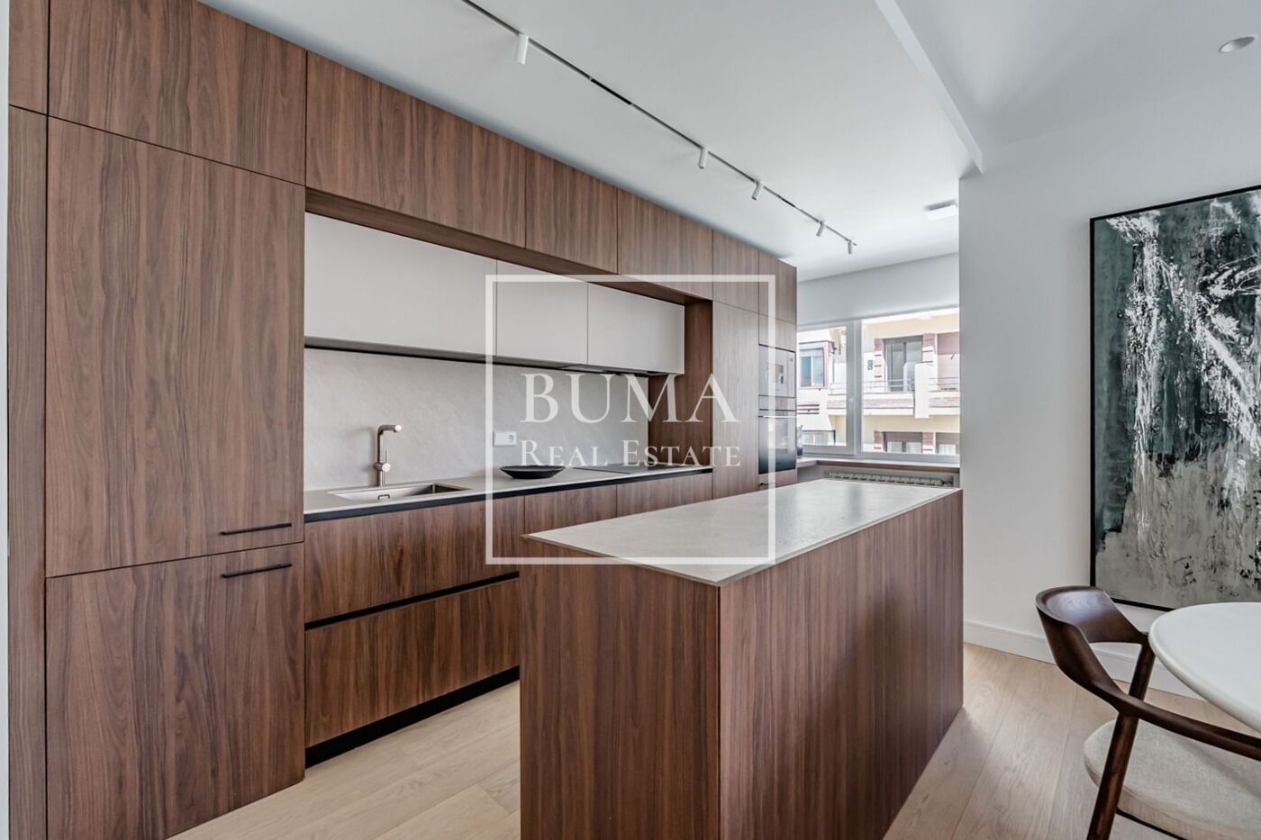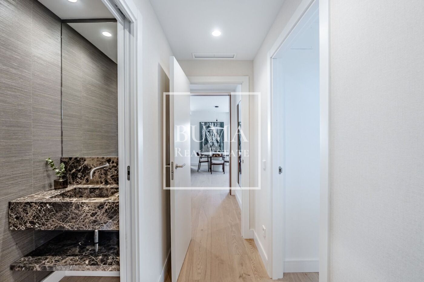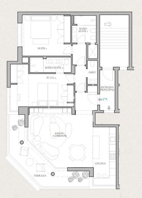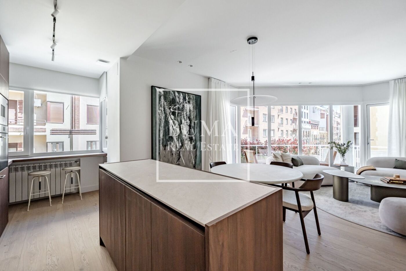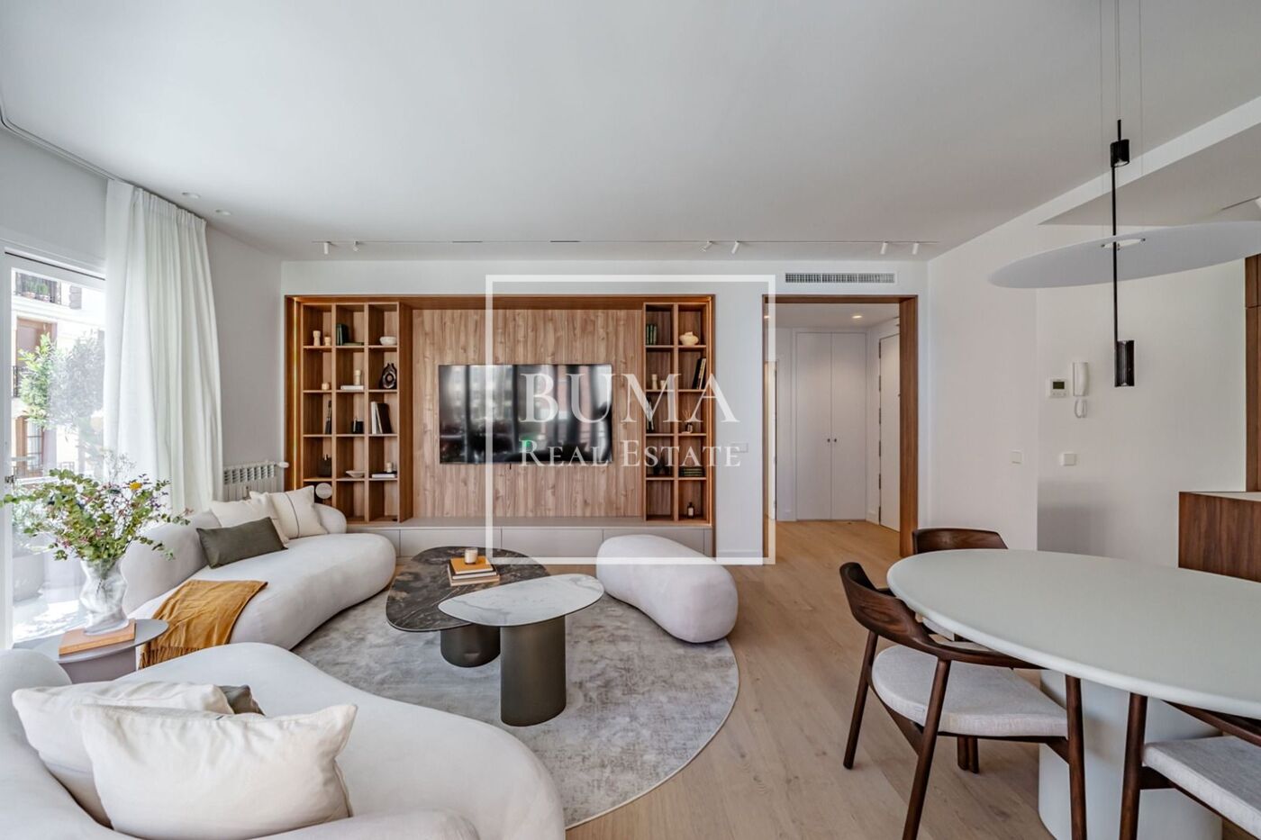 Situado en una tercera planta, destaca por su luminosidad y su cuidada reforma. La vivienda se organiza desde un hall de entrada que da paso a una zona de día amplia y abierta, con salón-comedor y acceso directo a la terraza a través de grandes ventanales de suelo a techo, aportando continuidad y luz al espacio. La cocina, integrada, es también exterior y cuenta con ventana.