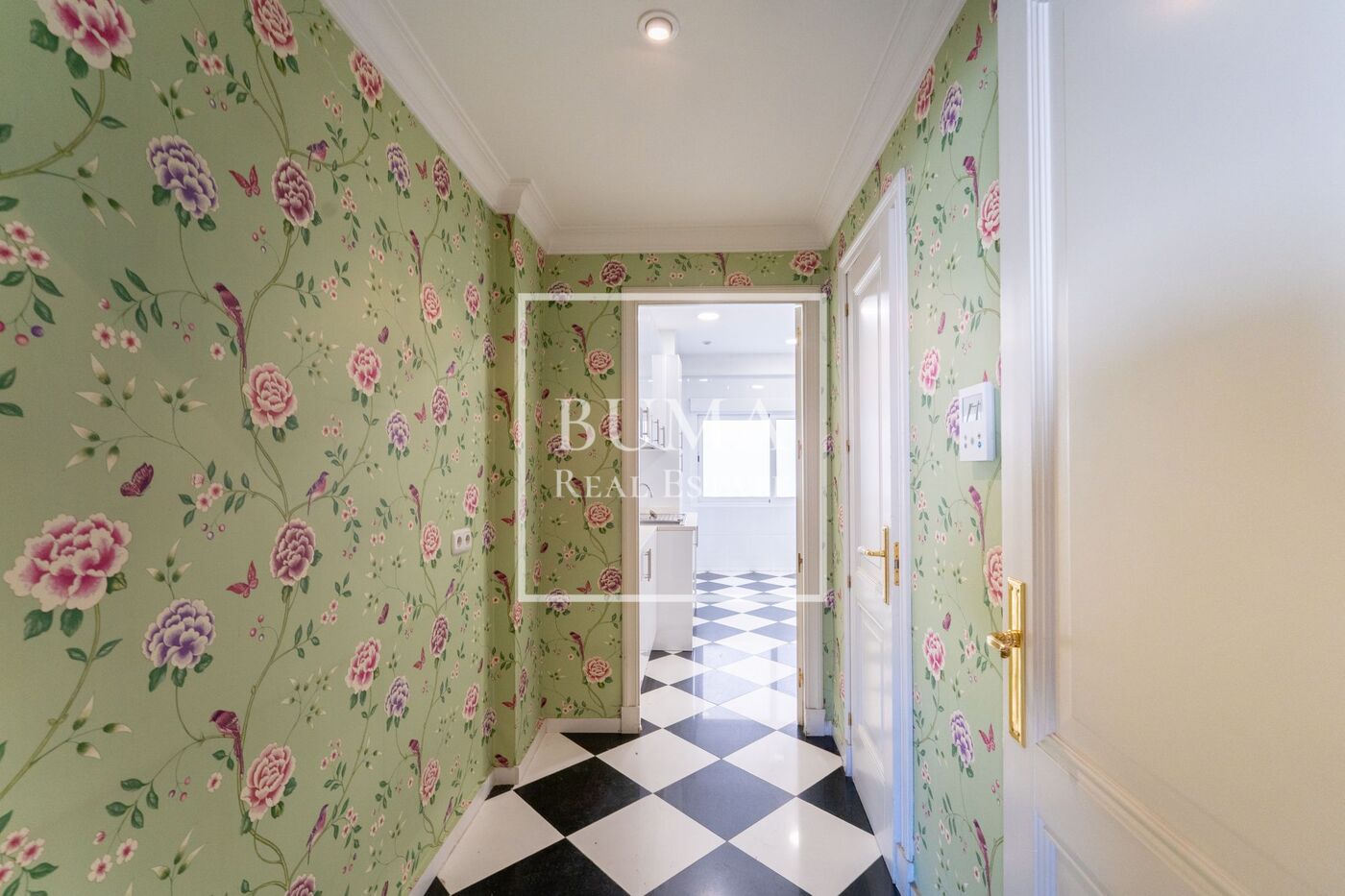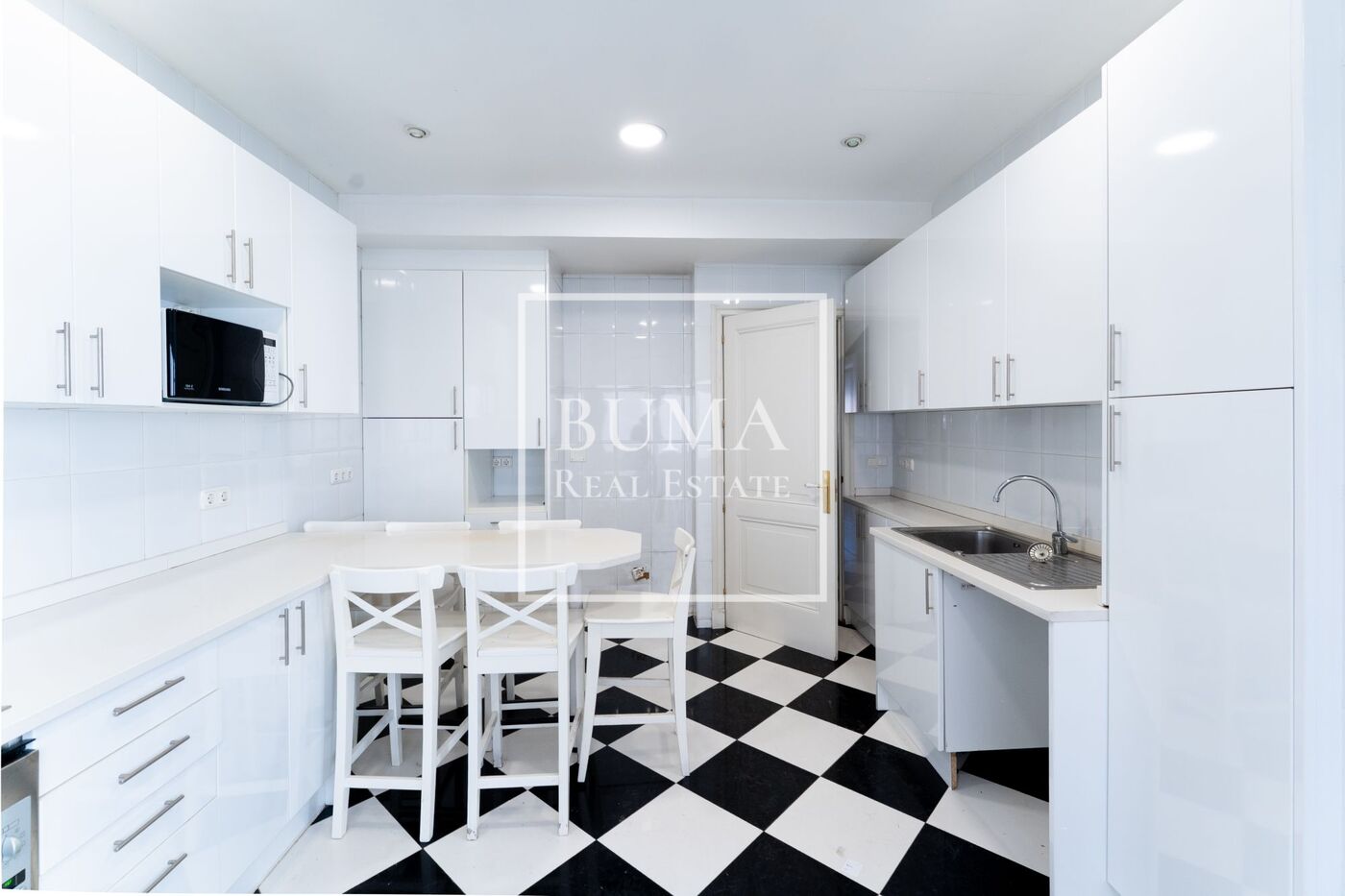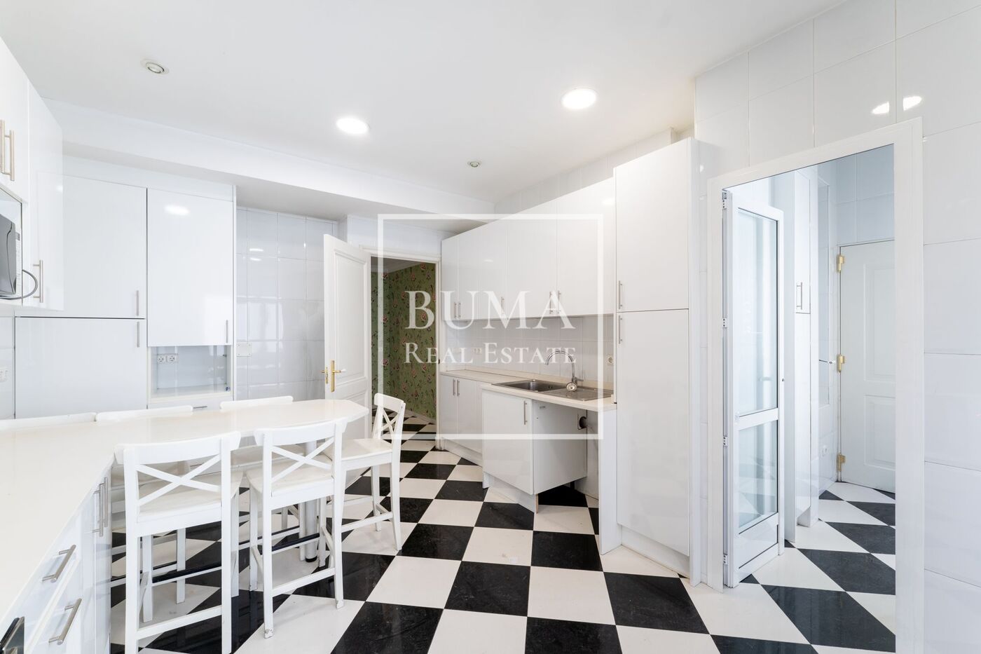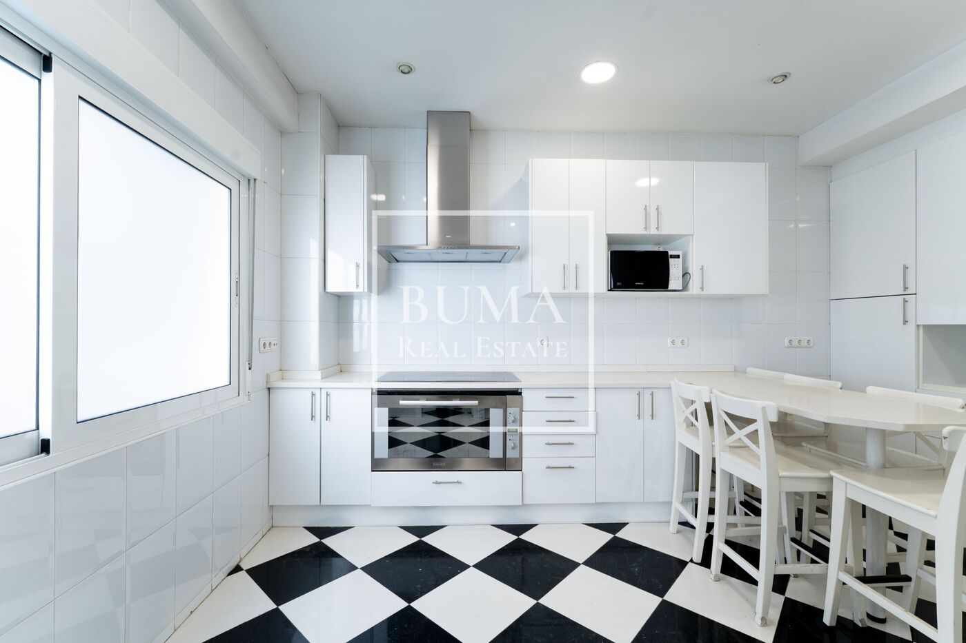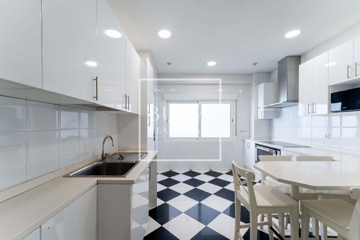 La cocina, situada a la izquierda del pasillo, está totalmente independiente del resto de la vivienda y dispone de zona office, todos los electrodomésticos, salida de servicio y lavandería. Gracias a sus grandes ventanales, cuenta con excelente luz natural.