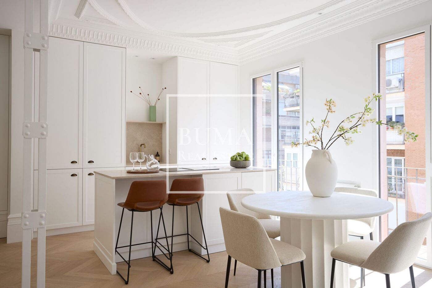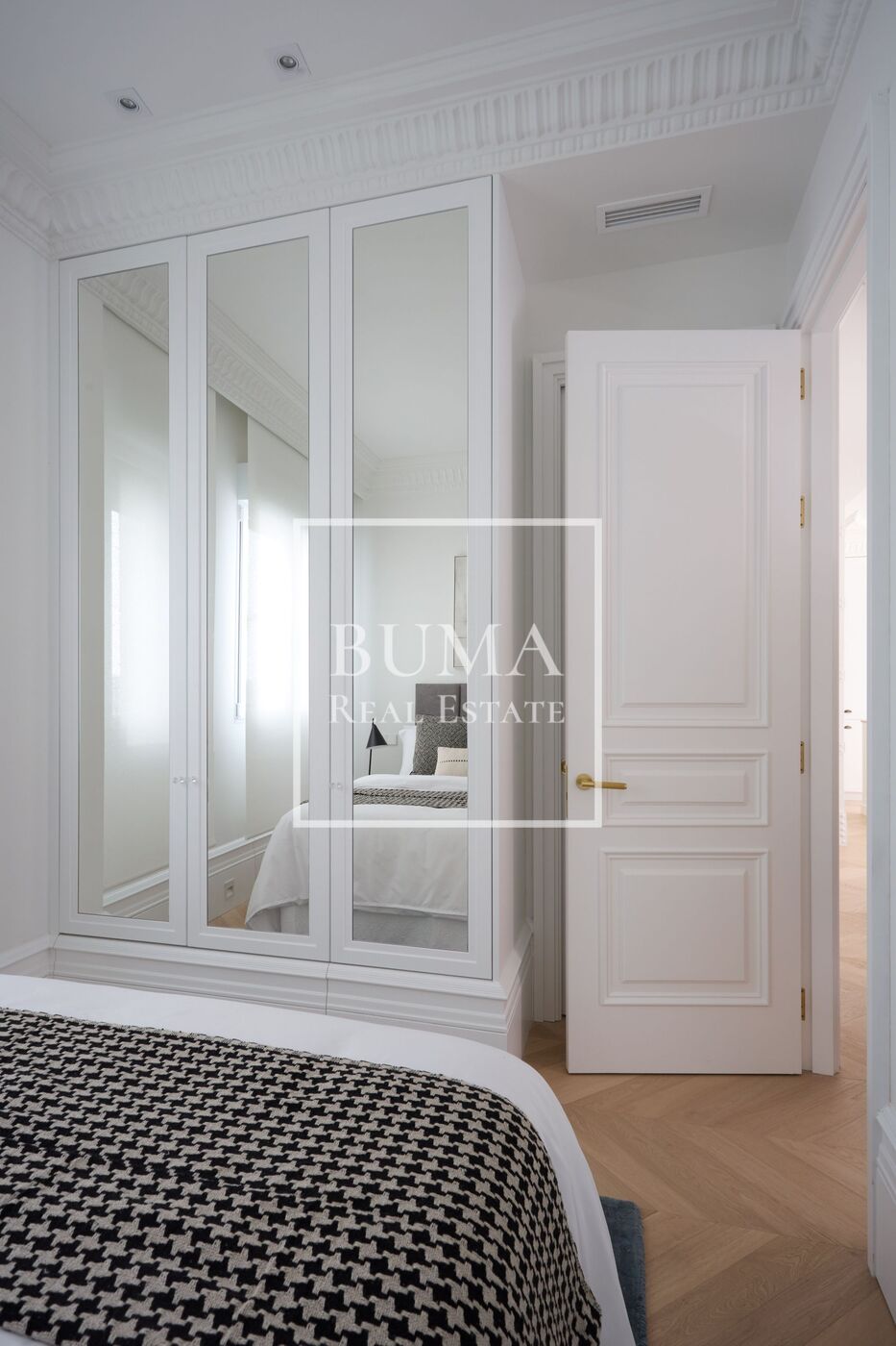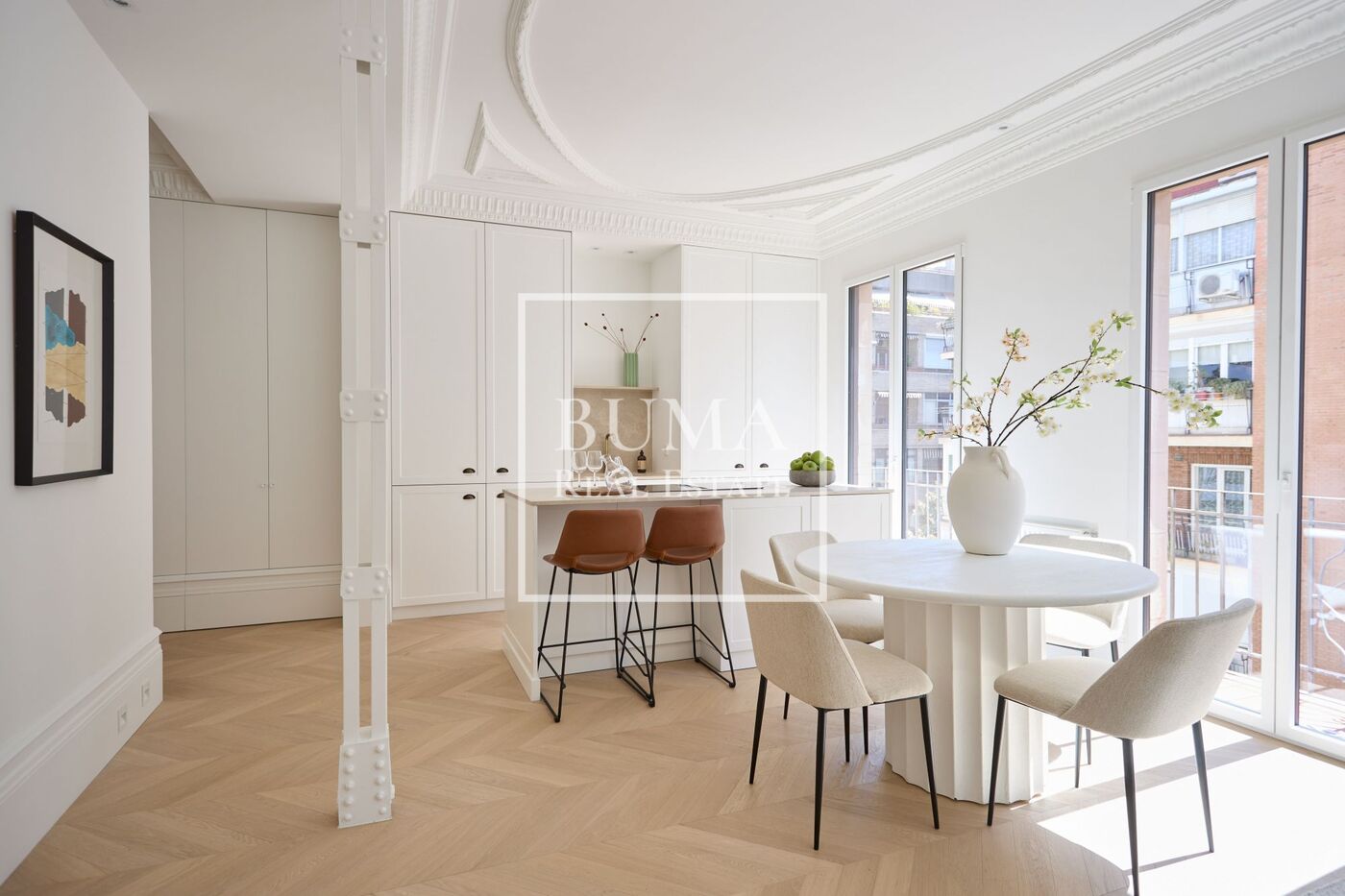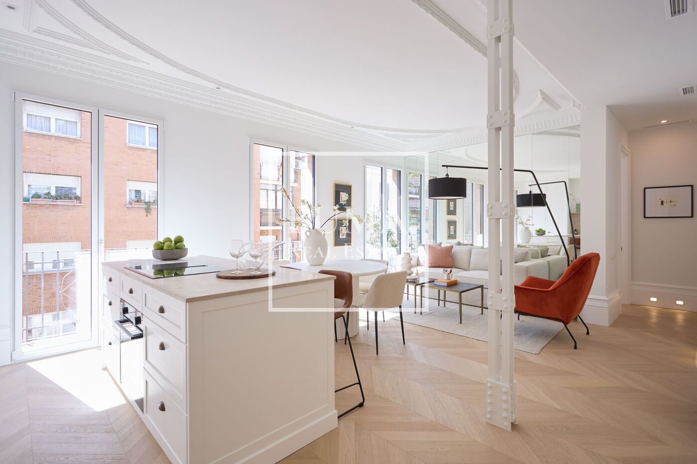 La vivienda dispone de cuatro balcones a la calle y techos de 3 metros de altura. La reforma se ha realizado cuidando cada detalle: molduras originales, suelos de madera, aire acondicionado por conductos, iluminación indirecta en el pasillo y armarios empotrados.