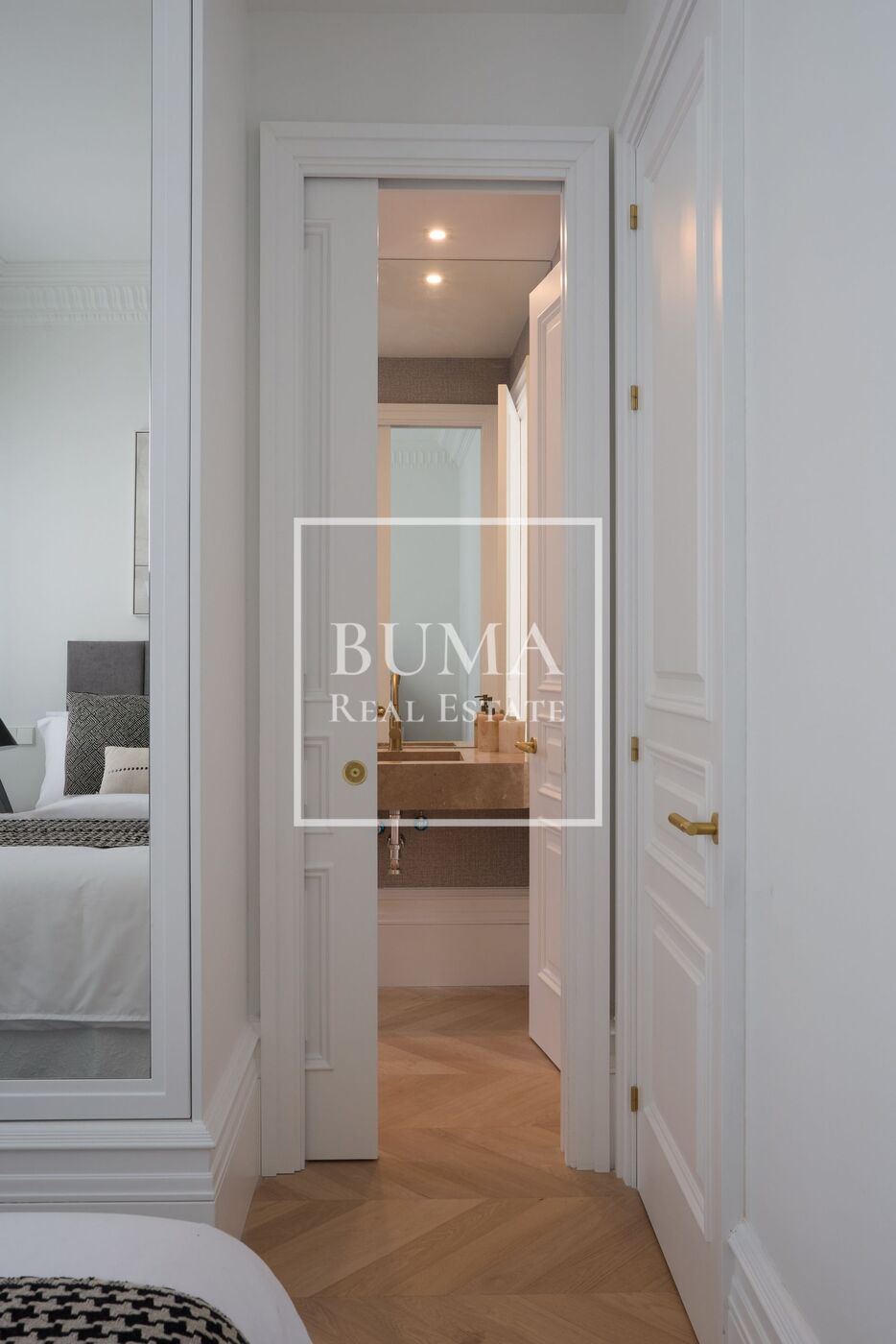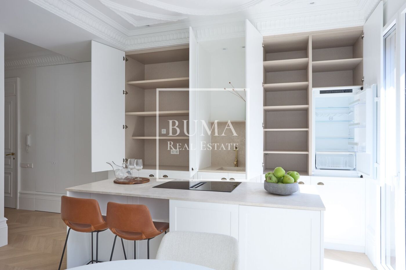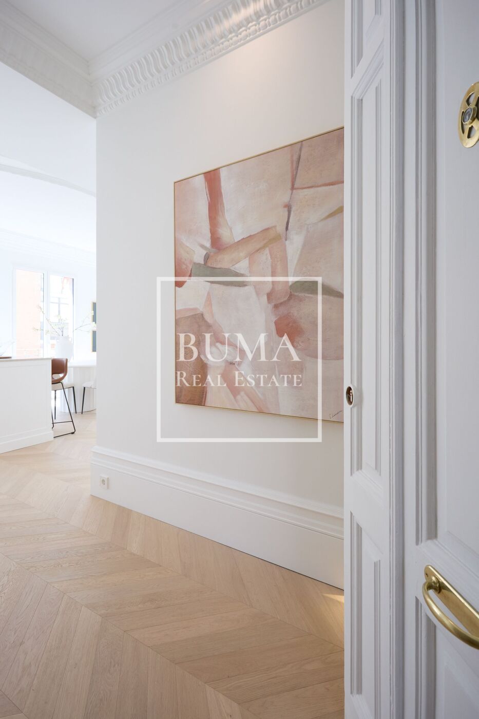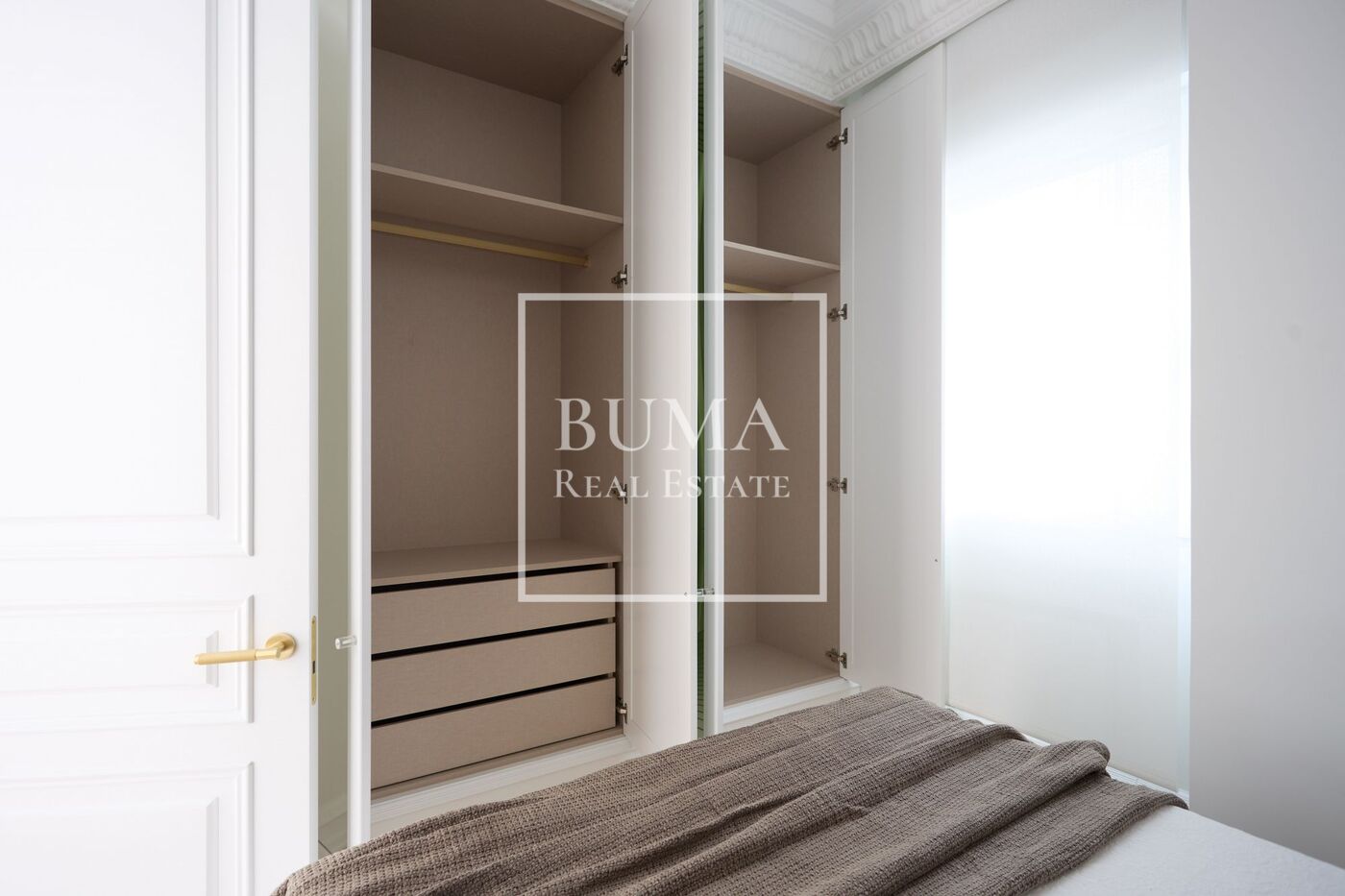 La vivienda dispone de cuatro balcones a la calle y techos de 3 metros de altura. La reforma se ha realizado cuidando cada detalle: molduras originales, suelos de madera, aire acondicionado por conductos, iluminación indirecta en el pasillo y armarios empotrados.