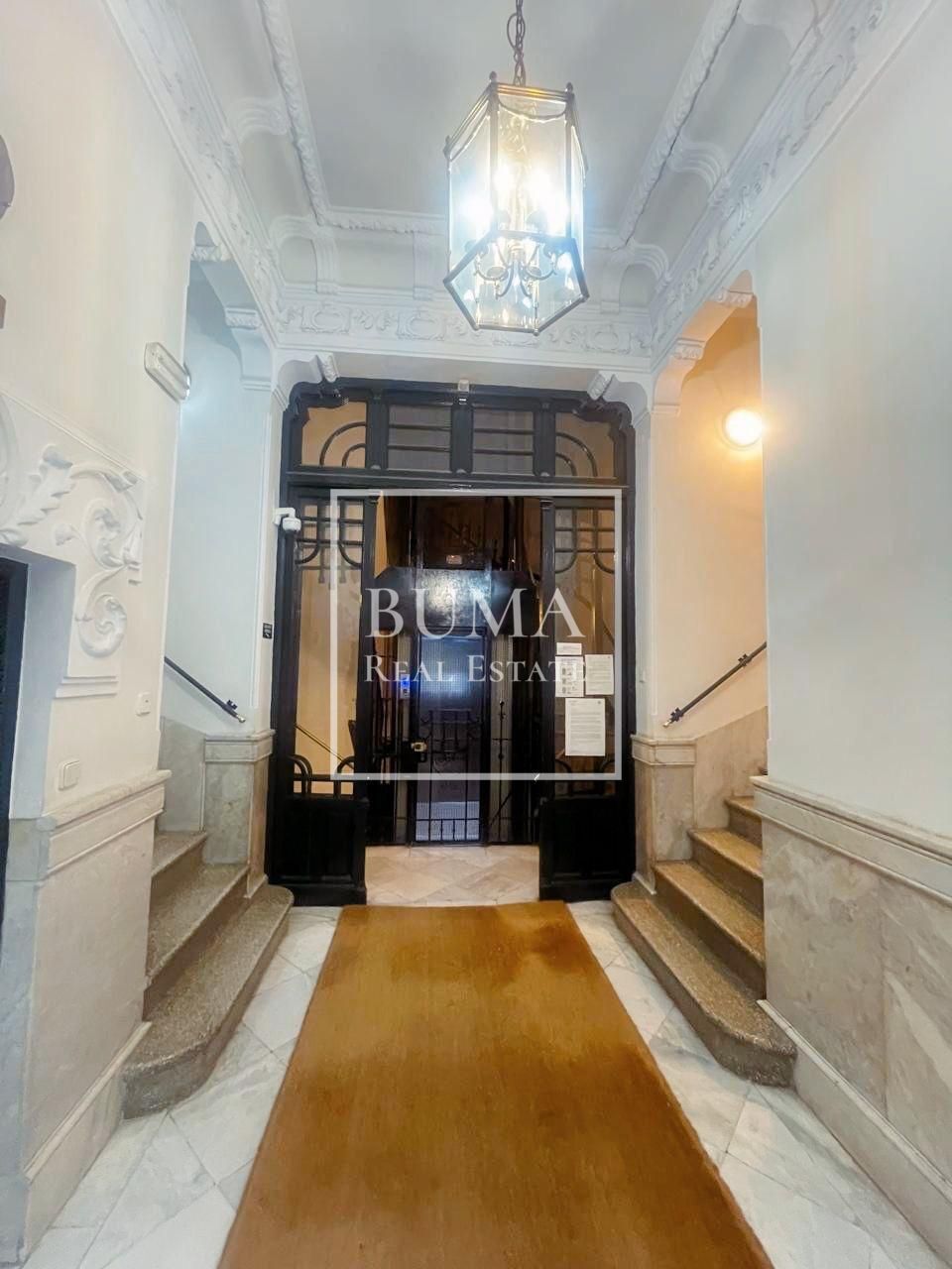 La propiedad se encuentra en la segunda planta de un edificio señorial de 1910 con servicio de conserjería, conservando elementos arquitectónicos originales que aportan carácter y sofisticación. Sus generosos techos con molduras y la excelente entrada de luz natural realzan la amplitud y el ambiente refinado de la vivienda.