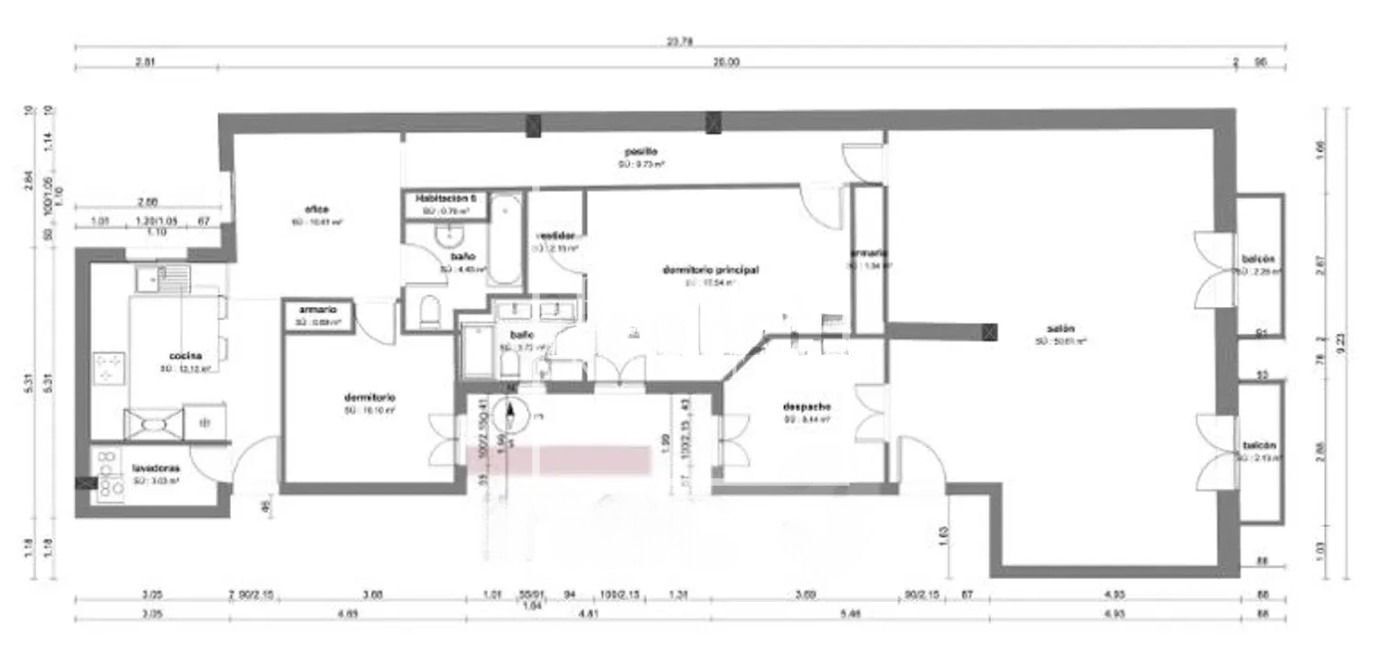 Con 177 m² construidos, la vivienda cuenta con un amplio salón-comedor orientado al este, con varios balcones que aportan luz natural y carácter al espacio. Incorpora además una zona de despacho, perfecta para teletrabajar o crear un rincón de estudio.